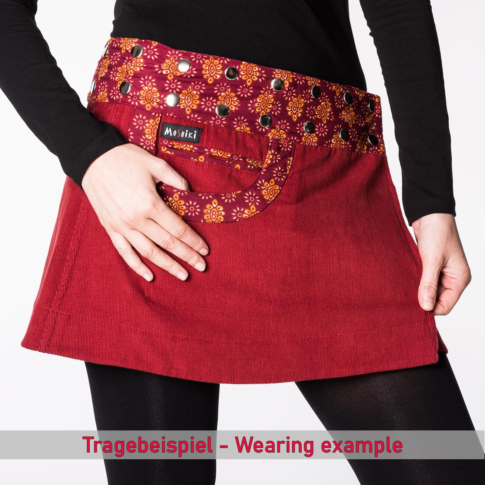 Während die Vorderseite mit variantenreichem Schnürlsamt (Cord) edel verarbeitet ist, bekommst Du auf der anderen Seite eine gemusterte Baumwoll-Variante geboten. So bist Du für jeden Anlass bestens gerüstet. Bei unseren Wende- und Wickelröcken kannst Du übrigens den Umfang ganz leicht variabel einstellen, wie auch hier.