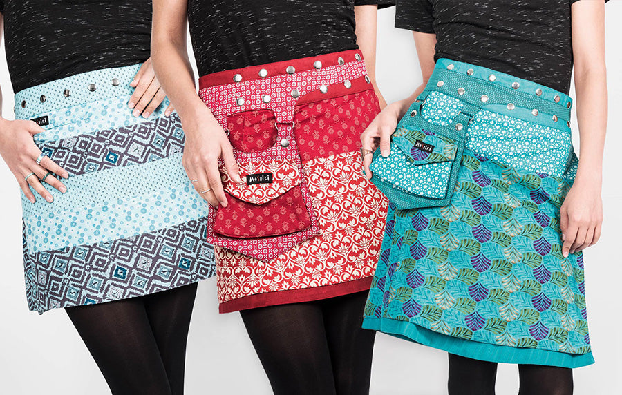 Die meisten der Wickelröcke sind wendbar, ja nach Modell ändert sich neben Muster und Farbe auch das Material auf der zweiten Seite. So kannst du ganz einfach den Rock wenden und praktisch in unter einer Minute deinen Style ändern!